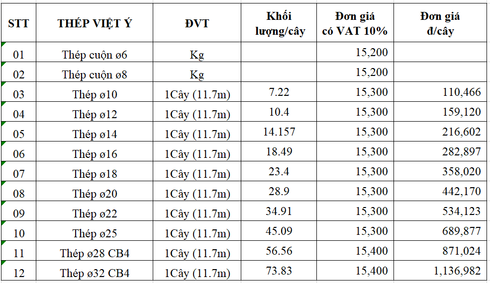 Bảng báo giá thép Việt Ý mới nhất hôm nay (tham khảo)